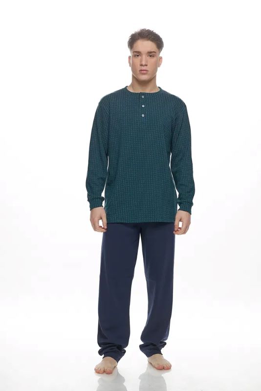 GALAXY ανδρική πυτζάμα. Κομψότητα και άνεση συνδυάζονται ιδανικά σε αυτή την ανδρική πυτζάμα ζακάρ με πατιλέτα, σχεδιασμένη για τον σύγχρονο άνδρα που εκτιμά την ποιότητα στις στιγμές χαλάρωσης. Διαθέσιμη σε δύο κλασικές αποχρώσεις – μπορντώ και πετρόλ, αποτελεί μια διαχρονική επιλογή για τον ύπνο ή τις ώρες στο σπίτι. Το πάνω μέρος της πυτζάμας είναι ζακάρ με διακριτικό ανάγλυφο μοτίβο και πατιλέτα με κουμπιά, προσθέτοντας ένα πιο σοφιστικέ στυλ. Το παντελόνι είναι μονόχρωμο, σε αρμονική απόχρωση με το επάνω μέρος, και διαθέτει ελαστική μέση για άνετη εφαρμογή.Κατασκευασμένη από 100% βαμβάκι υψηλής ποιότητας, προσφέρει εξαιρετική αίσθηση απαλότητας και διαπνοής.