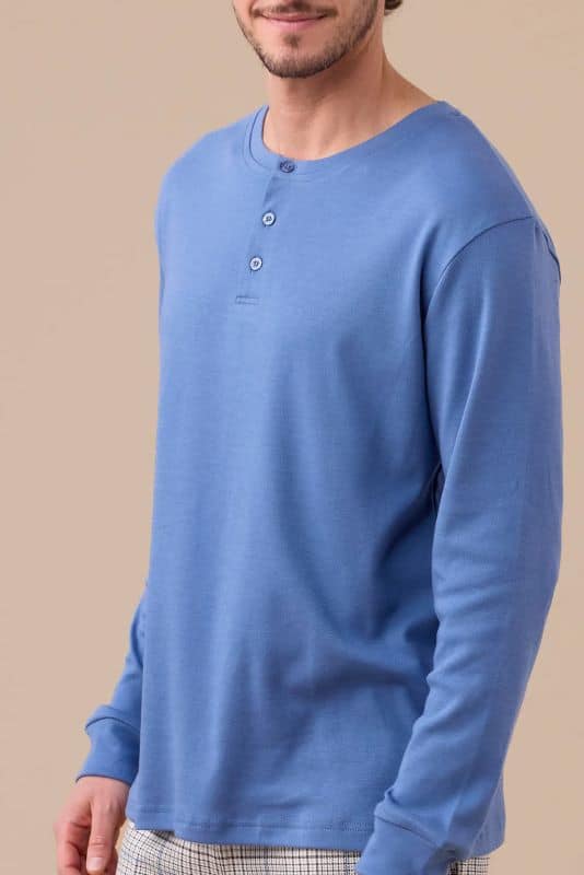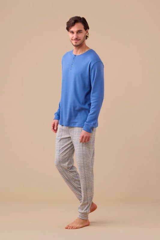 Noidinotte Ανδρική πιτζάμα από ζεστό βαμβακερό, μονόχρωμο τοπ με γιακά με τρία κουμπιά και παντελόνι με τύπωμα καρό και μανσέτες.