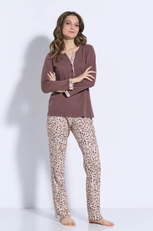 JEANNETTE γυναικεία πυζάμα με πατιλέτα, μονόχρωμη μπλούζα και εμπριμέ παντελόνι, από 100% βαμβάκι άριστης ποιότητας, ιδανικό για τους χειμερινούς μήνες.