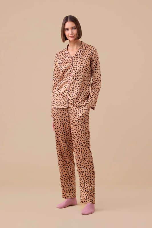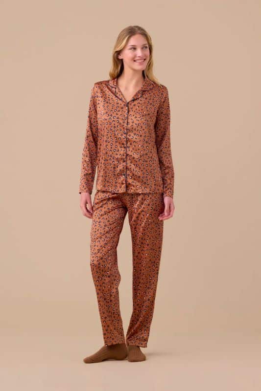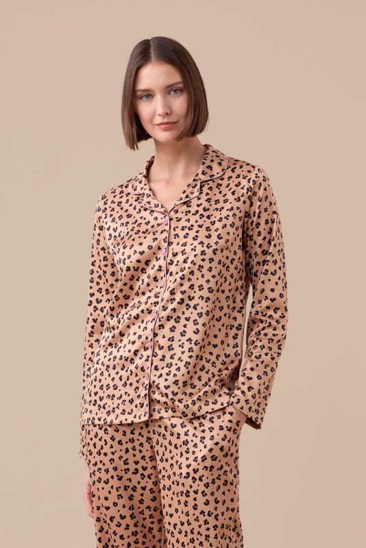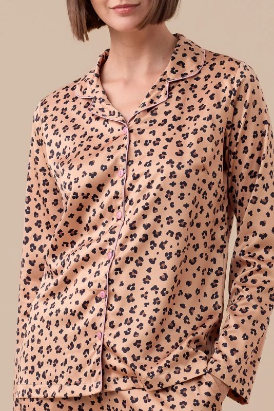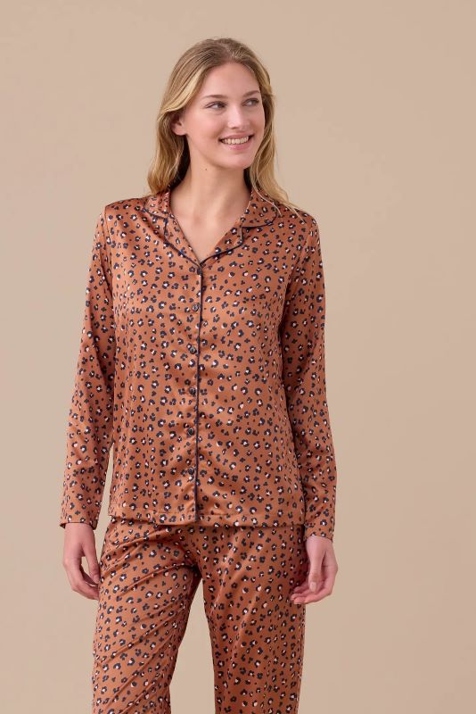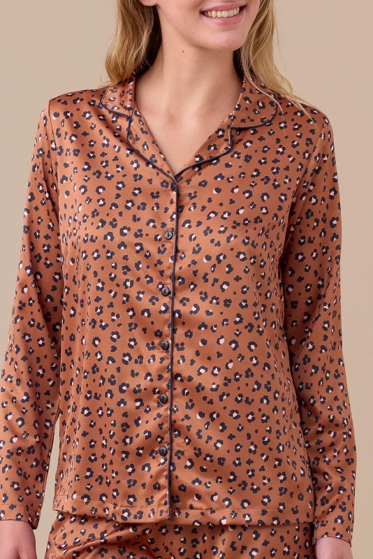 Noidinotte Γυναικεία σατέν πιτζάμα με animal print. Ανδρικό τοπ με τελείωμα σε αντίθεση. Παντελόνι με τσέπες.