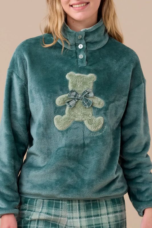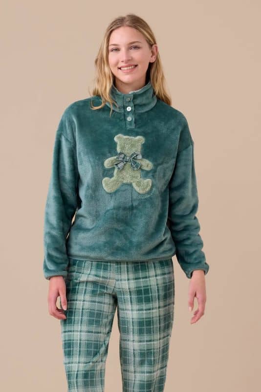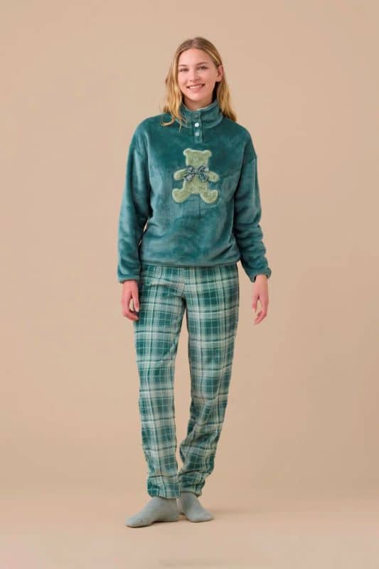 Noidinotte Γυναικεία κοραλί πιτζάμα με τοπ με τρία κουμπιά και απλικέ με αρκουδάκι. Παντελόνι με ταρτάν και μανσέτες.