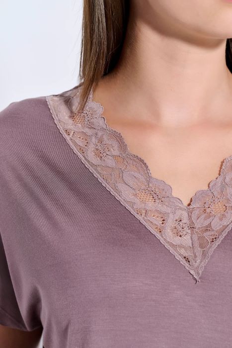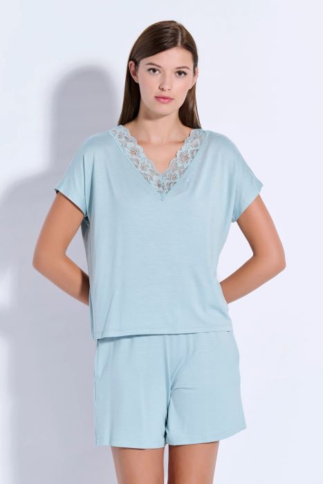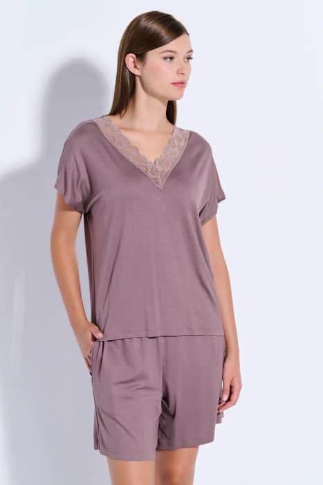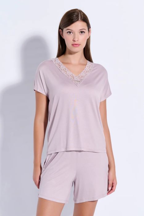 Γυναικεία πυτζάμα σε τρείς φανταστικές αποχρώσεις με V, βερμούδα και δαντέλα στο V.