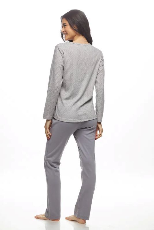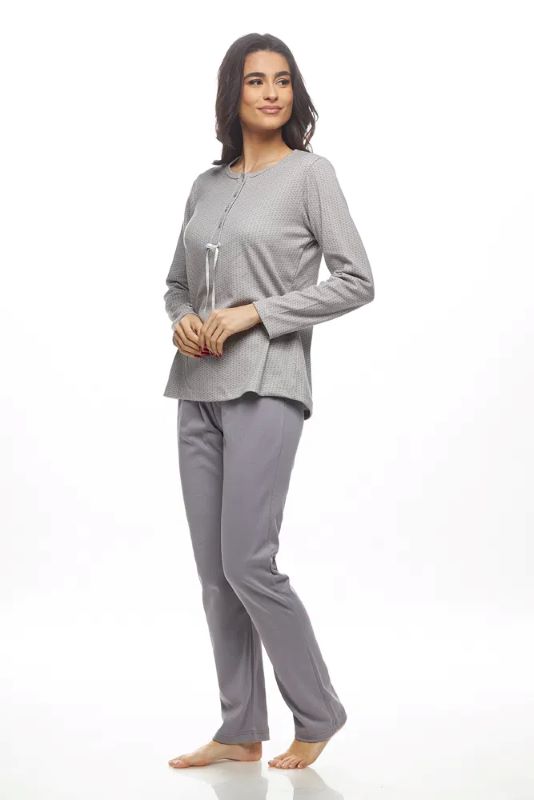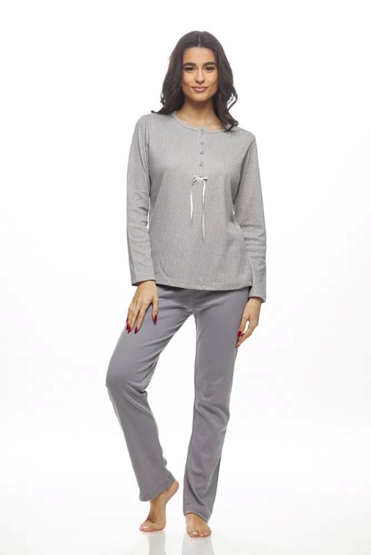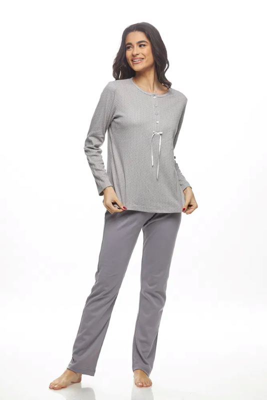 GALAXY γυναικεία πυτζάμα. Ανακάλυψε τη διαχρονική κομψότητα σε μια minimal και άνετη εκδοχή! Η γυναικεία χειμωνιάτικη πυτζάμα σε απαλή γκρι απόχρωση συνδυάζει απλότητα και ρομαντισμό, με διακριτικά 3 κουμπάκια στο μπροστινό μέρος και χαριτωμένο φιόγκο στη μέση, που χαρίζουν μια γλυκιά, θηλυκή πινελιά. Φτιαγμένη από 100% φυσικό βαμβάκι, προσφέρει εξαιρετική απαλότητα και διαπνοή, ιδανική για άνετο ύπνο και ζεστές στιγμές χαλάρωσης.
