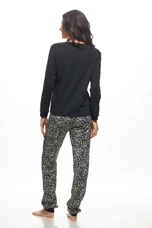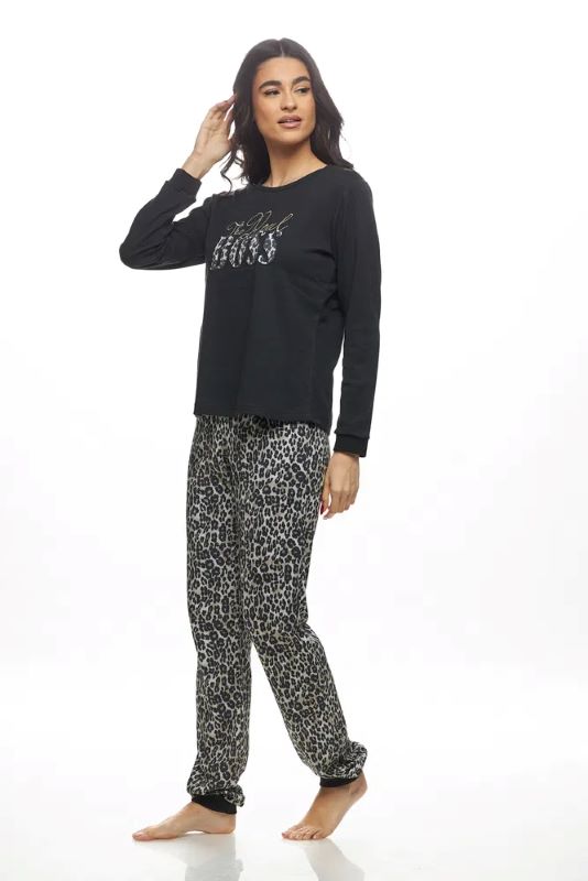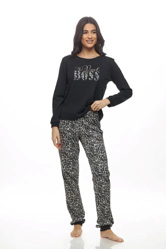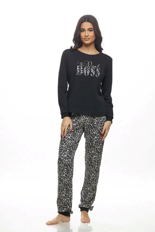 GALAXY γυναικεία πυτζάμα. Αναβάθμισε τις cozy εμφανίσεις σου με τη γυναικεία χειμωνιάτικη πυτζάμα Boss, που συνδυάζει το διαχρονικό μαύρο με το απόλυτο fashion statement του λεοπάρ. Η μακρυμάνικη μαύρη μπλούζα με εντυπωσιακό λογότυπο “Boss” αποπνέει αυτοπεποίθηση και στυλ, ενώ το λεοπάρ παντελόνι δίνει παιχνιδιάρικη και μοντέρνα νότα. Κατασκευασμένη από 100% βαμβάκι, είναι ιδανική για άνεση, φυσική αίσθηση και ζεστασιά κατά τη διάρκεια του χειμώνα.
