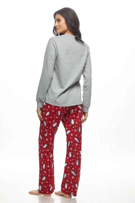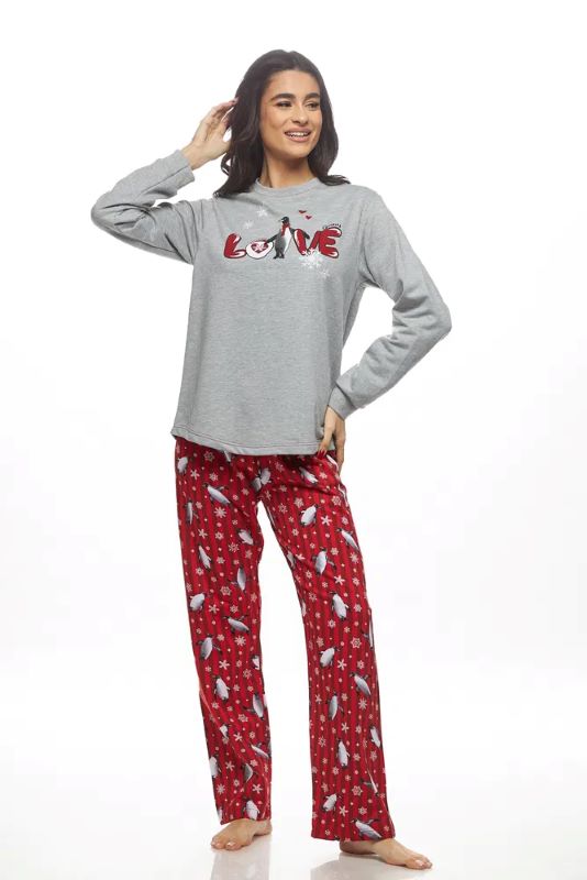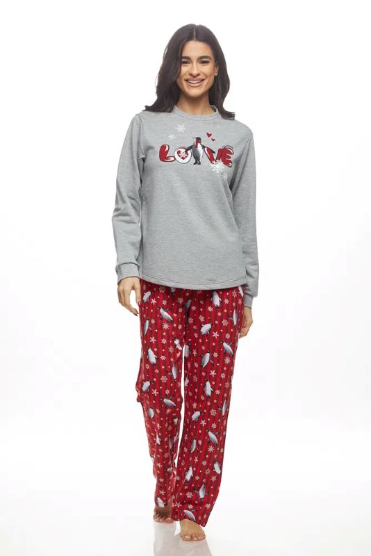 GALAXY γυναικεία πυτζάμα. Φέρε ζεστασιά και παιχνιδιάρικη διάθεση στα βράδια σου με τη γυναικεία πυτζάμα που συνδυάζει την κομψότητα με τη χαρά! Η γκρι μπλούζα με το στιλάτο λογότυπο “LOVE” αγκαλιάζει τη φιλική προς το δέρμα υφή του βαμβακιού, ενώ το κόκκινο παντελόνι με χαριτωμένα πιγκουινάκια προσθέτει μια χαρούμενη και ξεχωριστή πινελιά. Κατασκευασμένη από 100% βαμβάκι, προσφέρει απαλή αίσθηση, ζεστασιά και άνεση, ιδανική για τις κρύες νύχτες του χειμώνα.