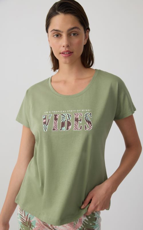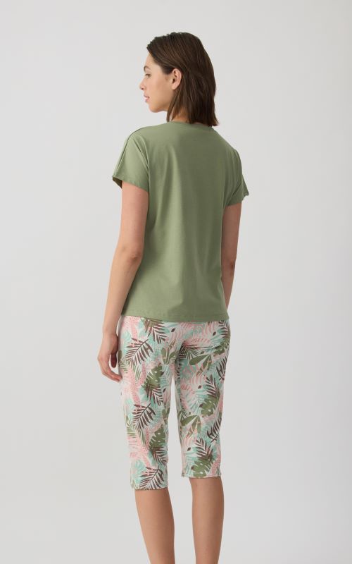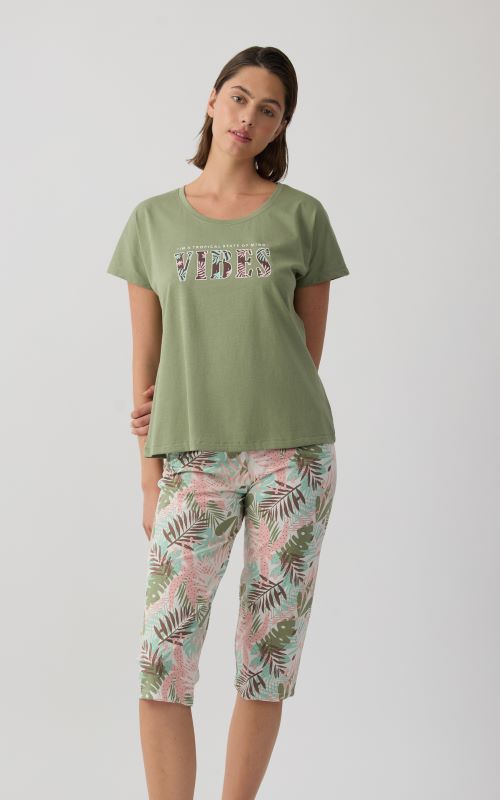 MINERVA Σετ πυτζάμα από 100% βαμβάκι εξαιρετικής ποιότητας που προσφέρει απαλή αίσθηση και άνεση καθ’ όλη τη διάρκεια της νύχτας. Το σετ αποτελείται από μονόχρωμη κοντομάνικη μπλούζα με διακοσμητικό τύπωμα στο στήθος και εμπριμέ floral capri παντελόνι με άνετη εφαρμογή.