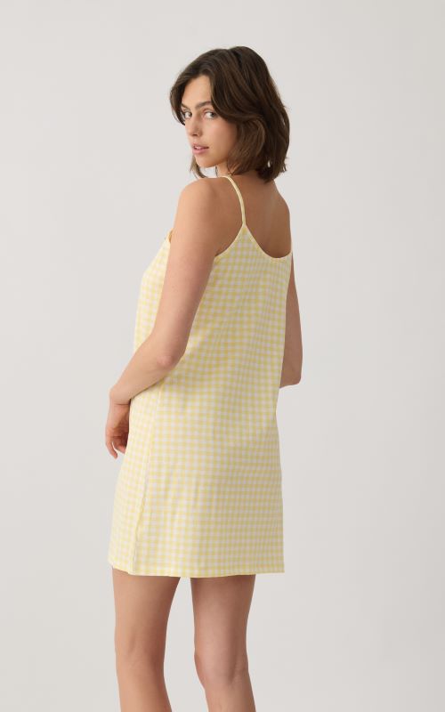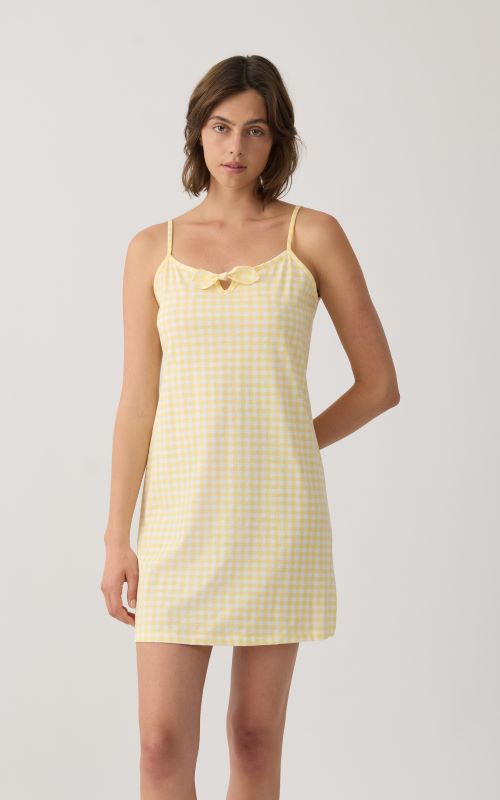 MINERVA Νυχτικιά με λεπτές μπριτέλες και κομψό καρό τύπωμα που χαρίζει φρέσκια και καλοκαιρινή αισθητική. Κατασκευασμένη από 100% βαμβακερό ύφασμα εξαιρετικής ποιότητας, προσφέρει απαλή αίσθηση και δροσερή άνεση κατά τη διάρκεια της νύχτας. Διαθέτει διακριτικό διακοσμητικό φιόγκο στο ντεκολτέ που προσθέτει μια θηλυκή λεπτομέρεια.
